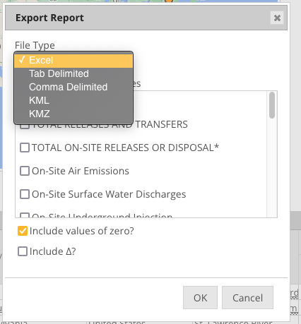 On the next screen you will see that there is an option to export the data. If you click on the menu there are a variety of file formats you can choose from. I downloaded Excel and Comma Delimited. You can also download KML or KMZ, both of which are Google Earth file formats. However those options are only available if you do not select all the on-site and offsite options. This is not such a big deal though because the data you download will include latitude and longitude for each individual facility anyway, so, if you’re interested in mapping or GIS the data are readily formatted for those kinds of applications without the need for KML or KMZ.