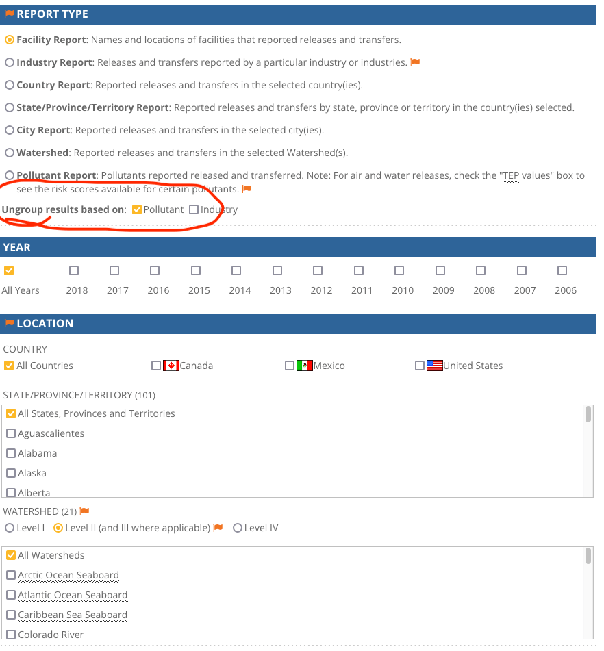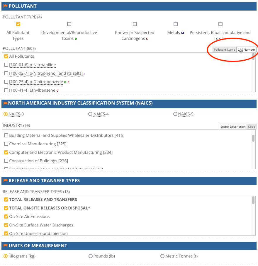 I wanted all pollutant types ungrouped by pollutant (see the area circled in red in the image above). This just means that the data are disaggregated chemical-by-chemical rather than combining them all into a single total value for weight. It’s also helpful to include the CAS number. The CAS number is an individual identifier given to particular chemical pollutants (more about CAS here). Not all pollutants have such a number but many do, and having the CAS number can be useful for distinguishing what different types of pollution data you have. It is not necessary to have a CAS number but it can help for certain analyses (see area circled in red in image below).