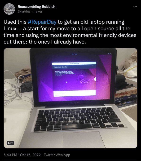 The project began on Oct 15, 2022 which was International Repair Day. I took some time to load Ubuntu on to the MacBook Pro.