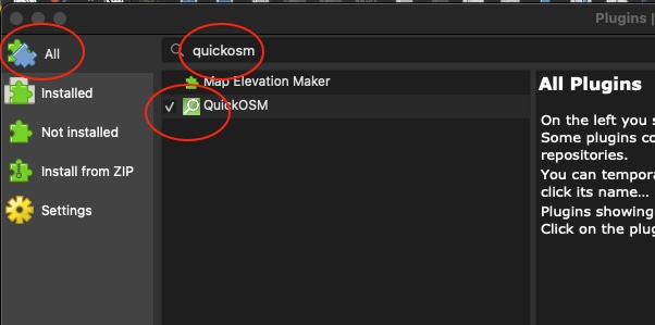 Step 1.3 find the list for “all” plug-ins and in the search bar search for “quickosm” and use the one-click install button (near bottom right, out of screenshot view).