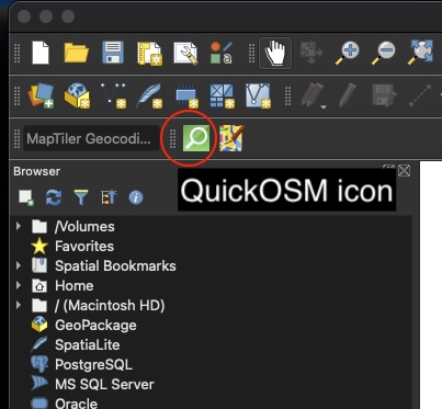 Step 1.4 Close the plug-in menu and return to the QGIS main screen. You should see an icon for QuickOSM in the toolbar, something like this (if you do not, make sure that all of the necessary toolbars are visible; QGIS’s built in help menu is very useful in showing where specific menu items are located and can be activated/deactivated.)
