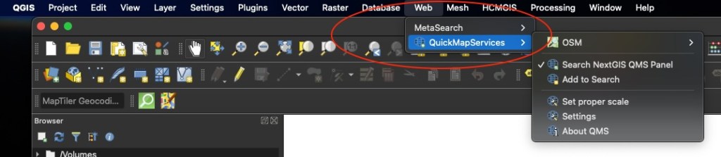 Step 1.5 If all you want to do is collect data on data centre locations (or another spatial entity) and be able to output a spreadsheet of those data, you are ready to go. On the other hand, if you want to be able to make maps within QGIS itself, then it can be very useful to install another plug-in called “QuickMapServices”. The “QuickMapServices” plug-in lets you use Open Street Map and a wide variety of other freely available maps as base maps for your work. Once installed, the “QuickMapServices” plug-in is available under the “Web” menu of QGIS (see screenshot below). I will also note the option of opening the “Search NextGIS QMS Panel” (see screenshot below) through which you can search for all sorts of other GIS ready data, including other base maps (I am a fan of ESRI’s “Gray (dark)” base map for example – – it can be found by searching “esri” in the”Search NextGIS QMS” panel if you open it).