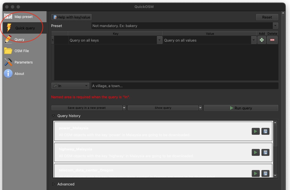 Step 2.1 click the “QuickOSM” icon. This will launch a pop-up menu. On the pop-up menu select “Quick query”.