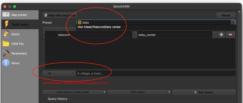 Step 2.2 in the “Preset” search query box type “data”. This will trigger a built-in preset search query for “Man Made/Telecom/Data center” (yes, the gendering is built-in). Select that category and then look below it to the button for the spatial extent of the search (the default is called “In”). You can use the default setting of “in” to search for data centres in a given location. As the menu suggests in the screenshot that location can be a village or town, but it can be other common geographical containers, like states, provinces or countries. Once you have your search parameters, click “Run query”. I’ll use Canada for the next steps.