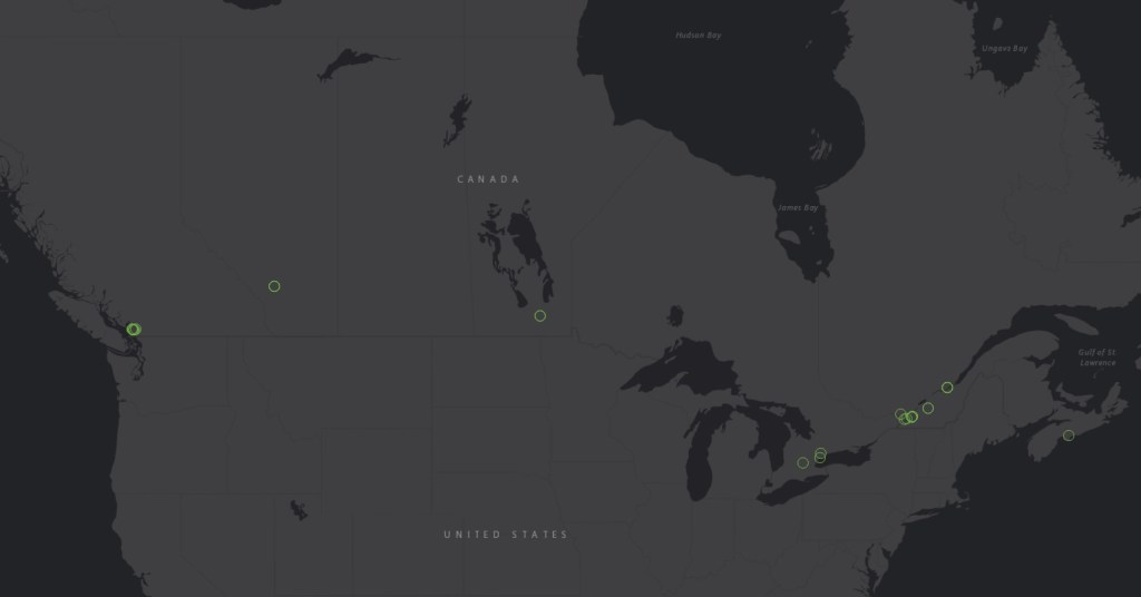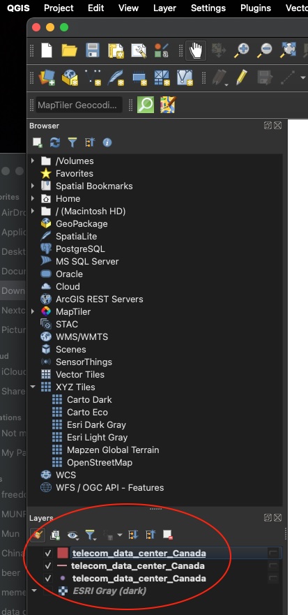 The Open Street Map process outlined above finds 49 data centres in Canada with a variable amount of other data associated with each location. All of the data on Open Street Map are covered by a license that states in part, ‘you are free to copy, distribute, transmit and adapt our data, as long as you credit OpenStreetMap and its contributors. If you alter or build upon our data, you may distribute the result only under the same license” (https://www.openstreetmap.org/copyright/ ). Those data come with geospatial coordinates that permit mapping using a variety of software other than Open Street Map itself, including fully functional GIS platforms, such as QGIS. Not bad for cost free data one can collect from one’s desktop.