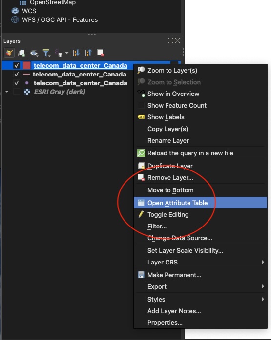 Step 2.4 to get a spreadsheet version of the data, right click on any of the three layers and select “Open Attribute Table from the pop-up menu. If you want to include latitude/longitude coordinates for each row of data, follow these steps: https://medium.com/@samath/qgis-adding-latitude-and-longitude-to-your-attribute-table-80d4ddbdc02b