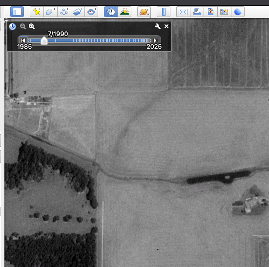Step 3.2 In the screenshot above, look at the menu options available toward the top of the UX and find the icon that looks like a clock with an arrow indicating reversal of time. This button enables you to select historical imagery. The range of dates available at any given location is variable. In this case, historical imagery is available backed to 1985 (note that depending on your purposes historical imagery may not be available at a useable resolution for your purposes). For my purposes here at this location and elevation the 1985 imagery is too low resolution, but the imagery for 1990 is fine.