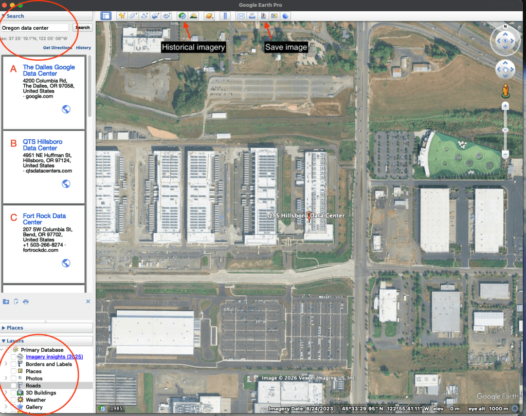 Step 3.1 for demonstration purposes, I searched “Oregon data center” (without quotes) in the search bar located toward the top left of the Google Earth Pro user interface (UX) and zoomed in on an area of interest. I have turned off all of the available options in “Layers” panel toward the bottom left of the UX. I turned those options off so that I could just focus on landscape features and buildings without being distracted by map labels, but you may wish to have map label options visible.